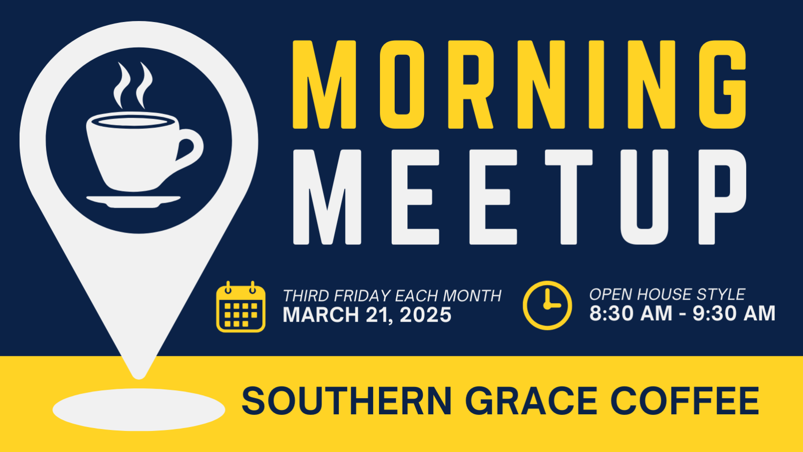 Start your morning with great company and a fresh cup of coffee! Join us at Southern Grace Coffee for a Morning Meetup on March 21st from 8:30 - 9:30 AM.