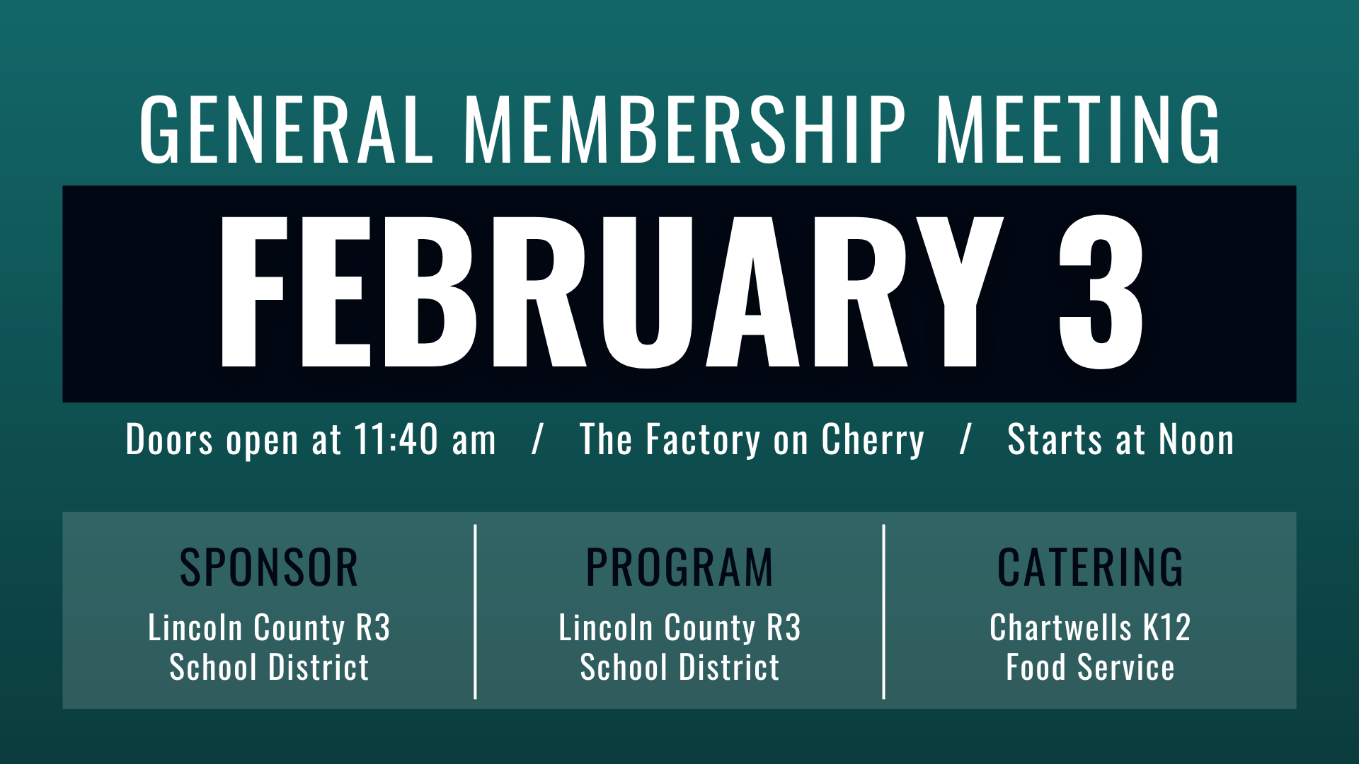 Catering numbers must be submitted 5-7 days prior to meeting date. In order to receive a credit toward next month's meeting, your cancellation must be received before 3pm on the Tuesday prior to the meeting date.
