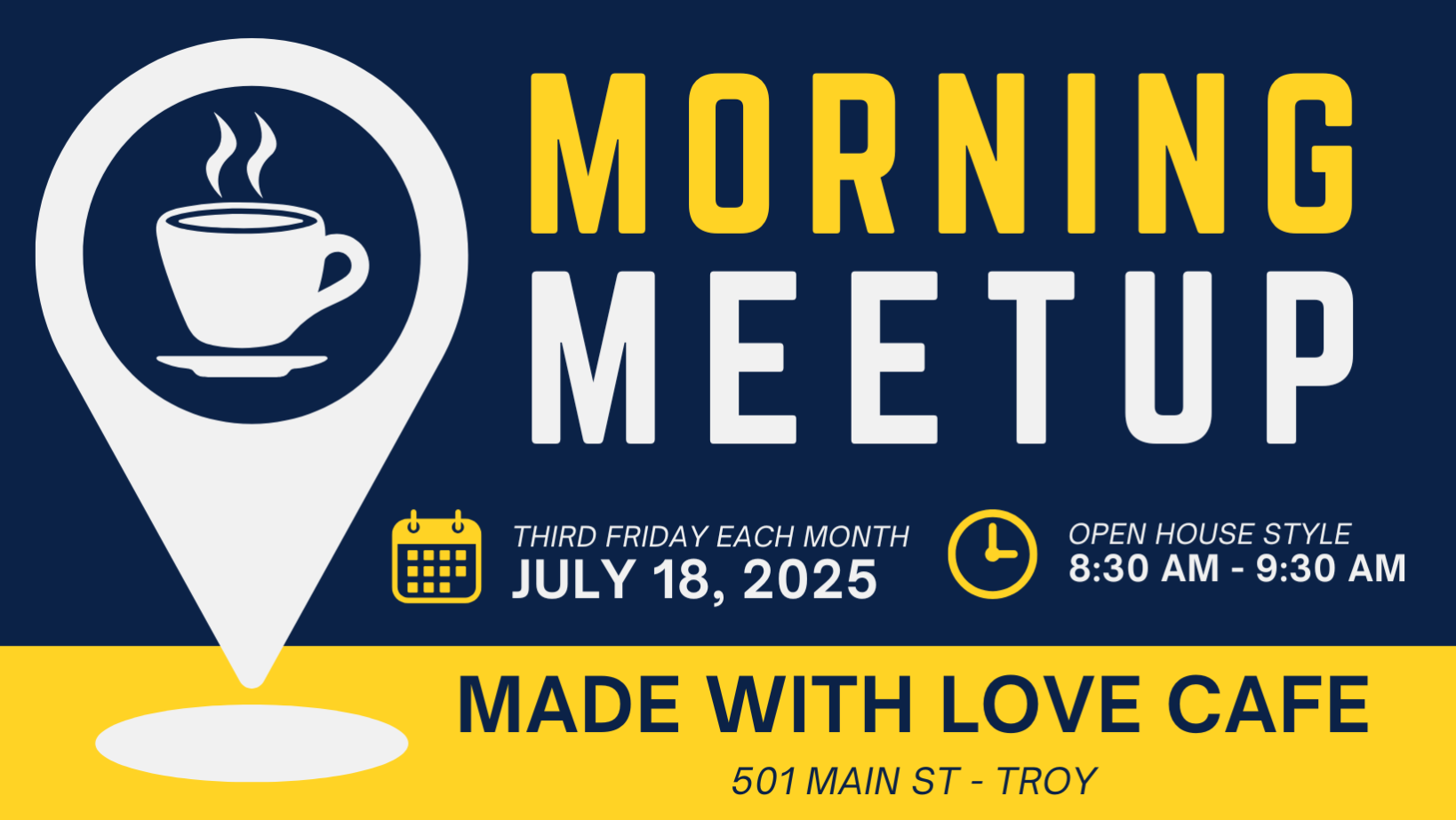 Start your day off right with networking, great coffee, and delicious food at Made with Love Cafe on Thursday, July 18th, from 8:30-9:30 AM!